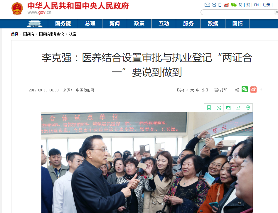 ‘两证合一’是推进医养结合深入发展的关键措施,一定要说到做到。”李克强总理在9月11日的